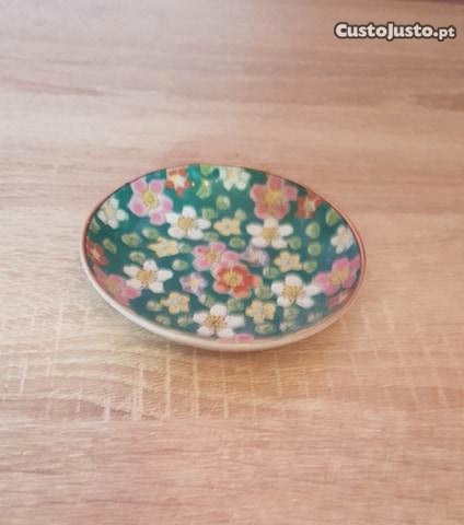 Prato em porcelana fina pintado á mão, com flores em tons de verde, amarelo, branco, rosa e vermelho, com rebordo em ouro. Made in Japan. 9cm de diâmetro.