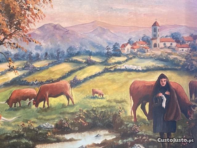 Lindo quadro, pintado em 1994 pelo reconhecido mestre José P. Almeida, retratando paisagem rural com pastora e vacas e com as medidas 69x86. Vendo por ser demasiado grande para a minha atual habitação.