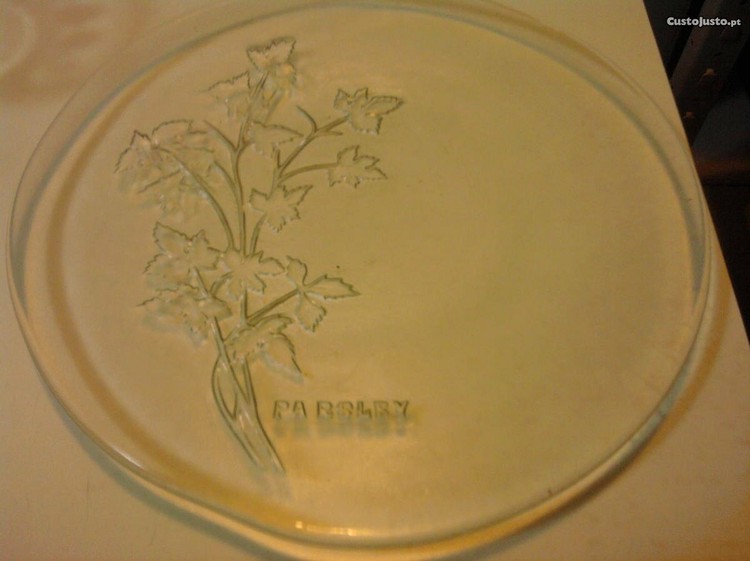 24 pratos rasos, em vidro transparente sem cor, com motivo floral em relevo. São raros. O molde já não existe. Marca CV.