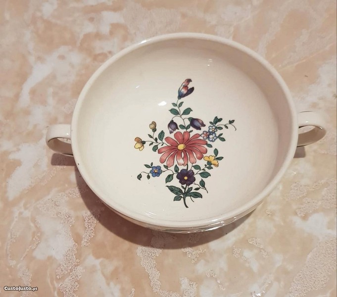 Taça com 2 asas, pintada á mão com flores da Villeroy & Boch, Mettlach Saan Ab Strasburg. 13,7cm de diâmetro.