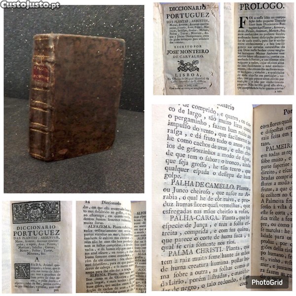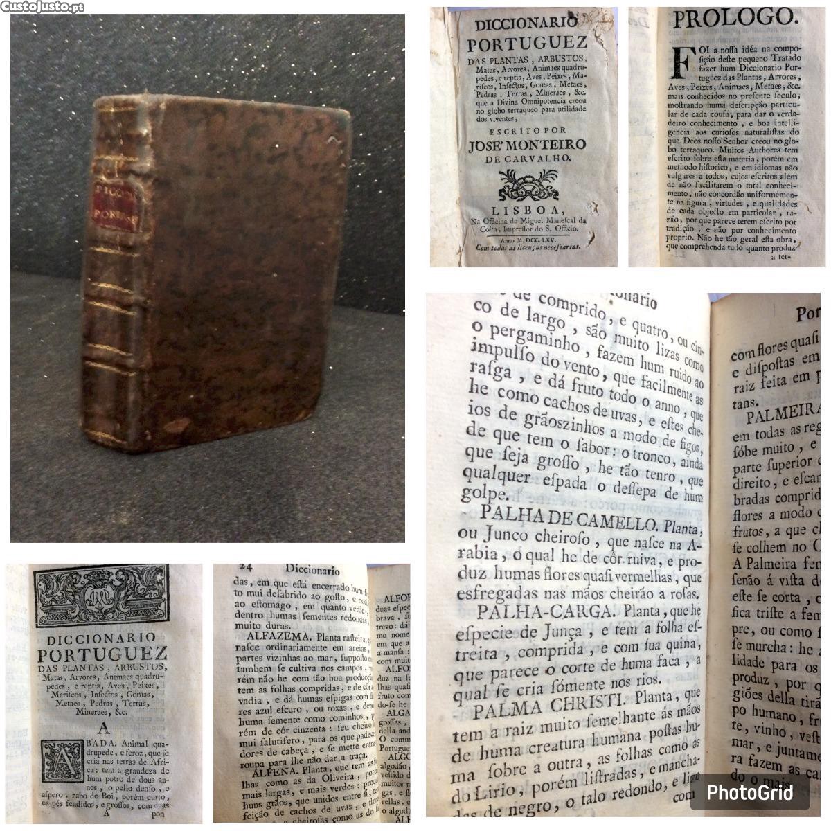 -Diccionario Portuguez Das Plantas, Arbustos, Matas, Arvores, Animaes quadrupedes, e reptis, Aves, Peixes, Mariscos, Insectos, Gomas, Metaes, Pedras, Terras, Mineraes, &c. que a Divina Omnipotencia creou no globo terraqueo para utilidade dos viventes, ESCRITO POR JOSÉ MONTEIRO DE CARVALHO. LISBOA, Na Officina de Miguel Menescal da Costa, Impressor do S. Officio. Anno M. D. CC. LXV. [1765] In 8.º de 14,5x9 cm. Com [viii], 600 págs. Encadernação da época inteira de pele.