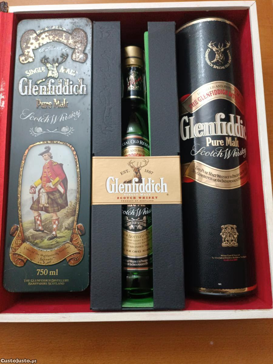 Cedência destas três garrafas de whisky glenfidrich excelente malte MT antigos com estojo