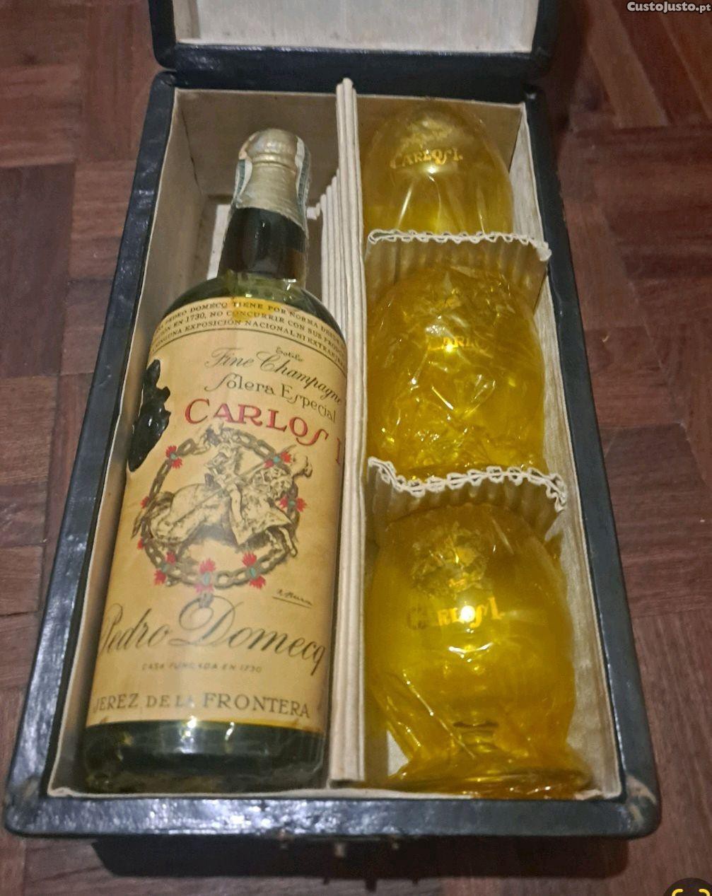 Conjunto Brandy Carlos I Solera Especial Garrafa anos 70 com caixa original e copos