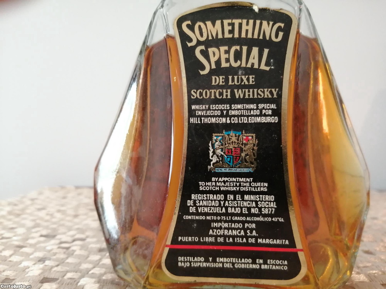 Uma garrafa de Something Special de Luxe Scotch Whiskey dos anos 70, de Hill Thomson. Importada/trazida da Venezuela, mais propriamente do Porto da Ilha Margarita. A garrafa está selada mas apresenta alguma perda, devido aos anos que tem.