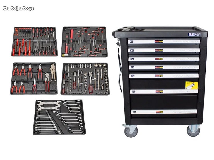 A empresa Chave Vertical Lda, comercializa um carro de ferramentas de qualidade da conceituada marca KROFTOOLS com 7 gavetas repletas de ferramenta: 160 peças ao todo onde se incluem todo o tipo de ferramentas que possamos imaginar.