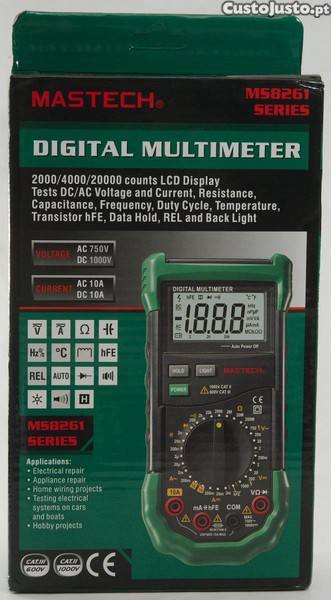 O novo multímetro digital Mastech MS8268 inclui muitos recursos interessantes, como som e luz de aviso e tela LCD retroiluminada. Este medidor usa três pilhas AAA. Os acessórios incluem cabos de teste e manual do utilizador, bem como socket especial para medição de condensadores e transistores