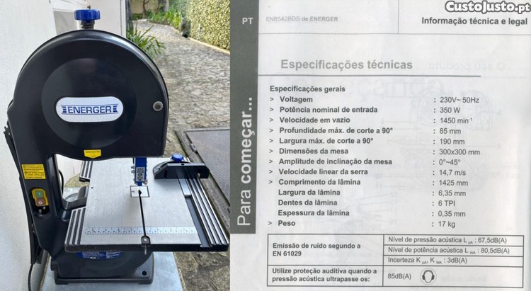 Serra de fita com muito pouco uso, em excelente condição, com uma lâmina nova suplente, manual de instruções, guia de esquadria de precisão -45/+45 e empurrador para peças pequenas.