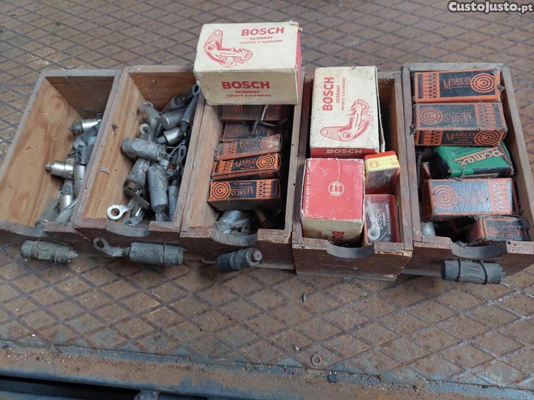 Diverças peças e acessorios para carros antigos ingleses, fanceses, italianos, alemaes, americanos, entre as quais juntas de colaça para 4 e 6cilindros, todo tipo de molas para aplicacões diverças na carroceria, platinados e condensadores, filtros de ar e oleo, lampadas 6 12 e 24 volts, casquilhos de lampadas, farolins em vidro, jogos de segmentos e bronzes, juntas de colectores, tampa de valvulas e carter, escovas de limpa vidros e braços das escovas, apoios, carmalheiras do volante do motor, tubos de agua, tampas e rotores de destribuidor, calços e cintas de travão etc.