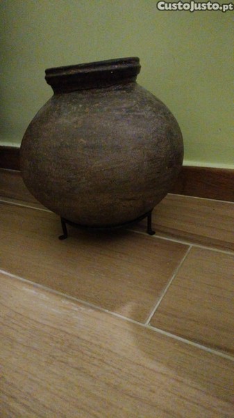 Pote de cerâmica rústico com suporte de ferro, de aparência envelhecida e desgastada pelo tempo. Fundo côncavo.