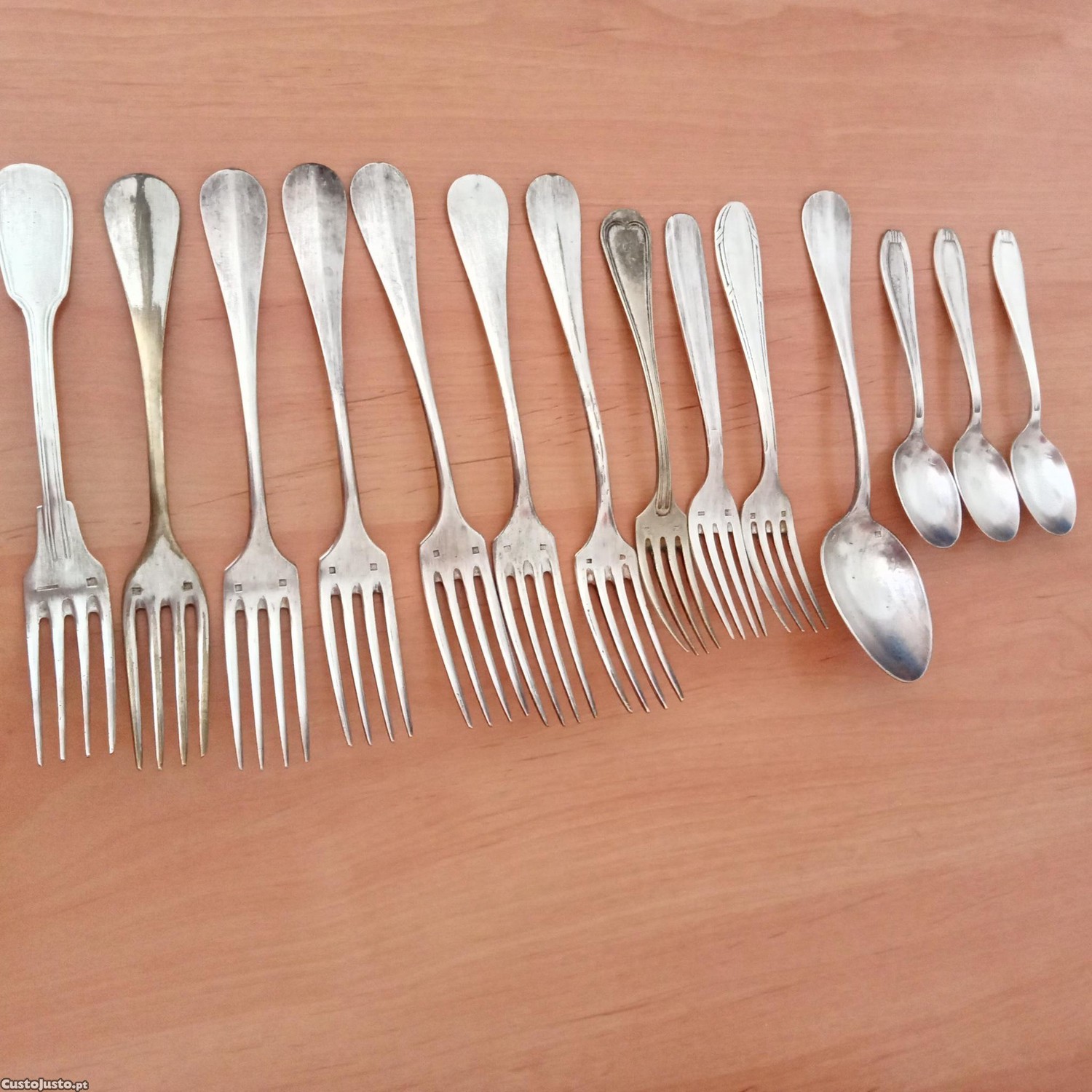 Conjunto em prata de 14 peças (10 garfos 4 colheres ) mto antigo 810 gramas venda a melhor oferta