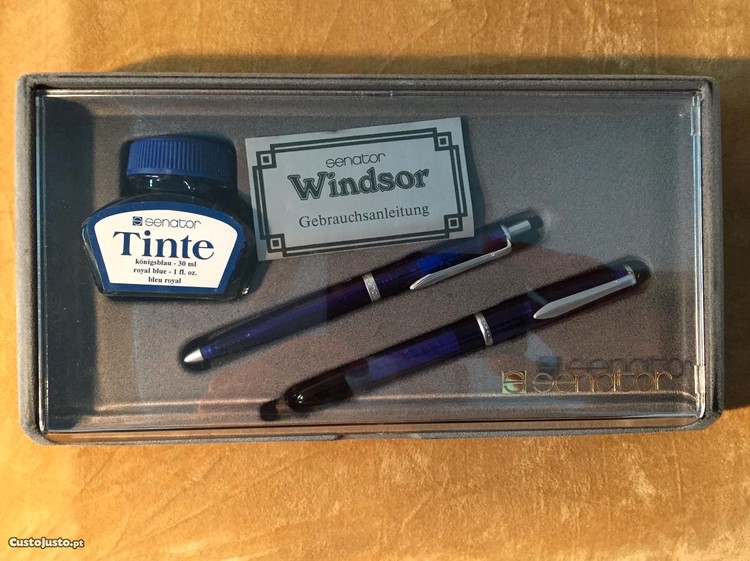 Embalagem com fountain pen, frasco de tinta (Royal Blue 30ml) e caneta esferográfica.