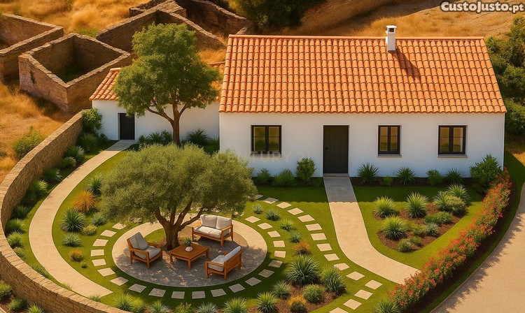 A casa dispõe de uma ampla sala com lareira, perfeita para noites tranquilas de inverno, mantendo a alma rústica do Alentejo intacta. No exterior, duas majestosas oliveiras centenárias e uma laranjeira oferecem sombra, frutos e um cenário pitoresco em todas as estações do ano.