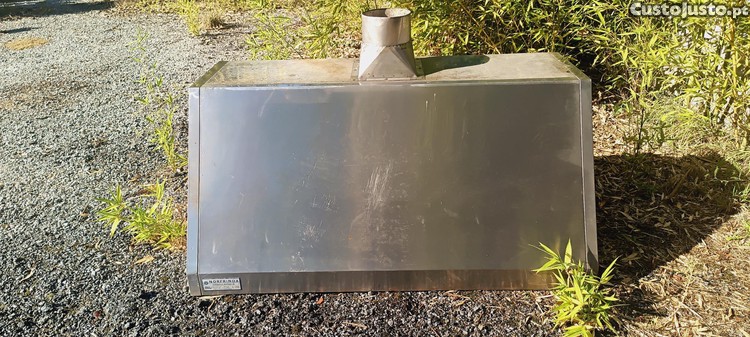 Chaminé de aço inoxidável usada, com design robusto e durável. Apesar de apresentar alguns sinais de uso, a chaminé mantém-se em bom estado de conservação e funcionalidade. Inclui 3 filtros.