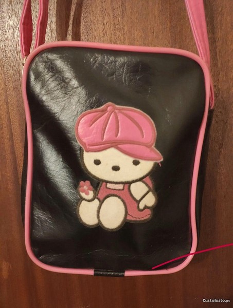 Vendo bolsa para menina preta com uma boneca na frente, tem a alsa para regular o tamanho, está em muito bom estado, tem um bolsinho por trás.