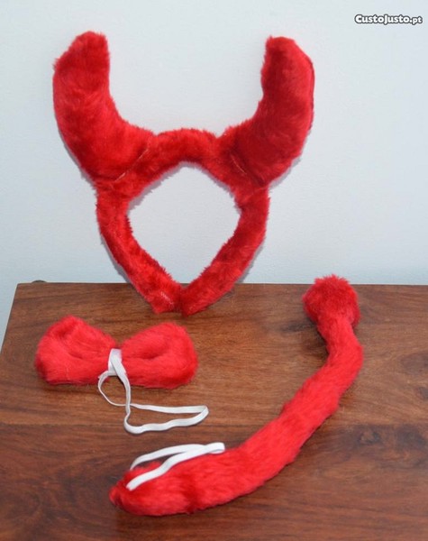 Fantasia Diabinha Sensual, consistindo num laço de pescoço, numa cauda e chifres de diabo, tudo em material peludo e macio de cor vermelho. Ideal para despedidas de solteiro(a) e afins.