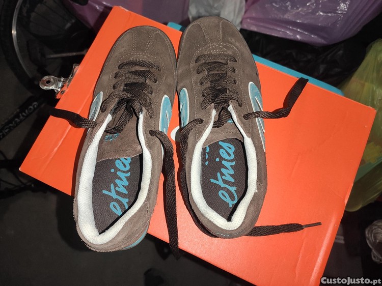 Sapatilhas Etnies em castanho com detalhes em azul.