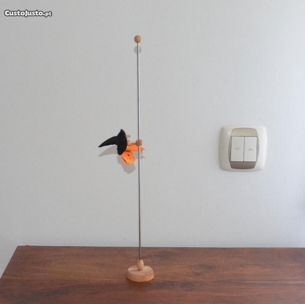 Peça artesanal invulgar, com base em madeira, varão em aço inox e bruxa com cabeça em resina e corpo em tecido, suspensa no varão através de uma mola em aço.