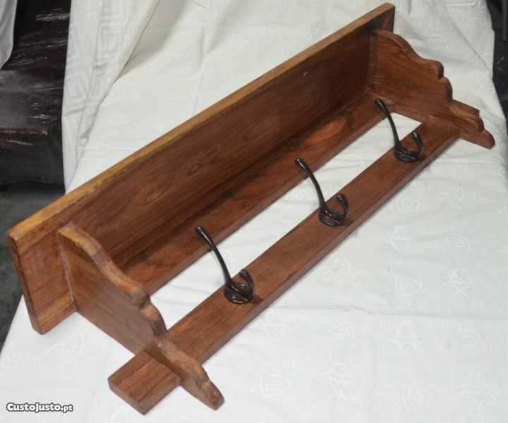 Bonito, original e elegante cabide em madeira com três ganchos de suporte em aço e com prateleira superior, destinado e preparado para ser pendurado numa parede. Fabrico artesanal de elevada qualidade. Trata-se de uma peça proveniente de uma conceituada loja de decoração que cessou a sua actividade, encontrando-se rigorosamente nova, pois nunca foi usada, nem sequer esteve em exposição.