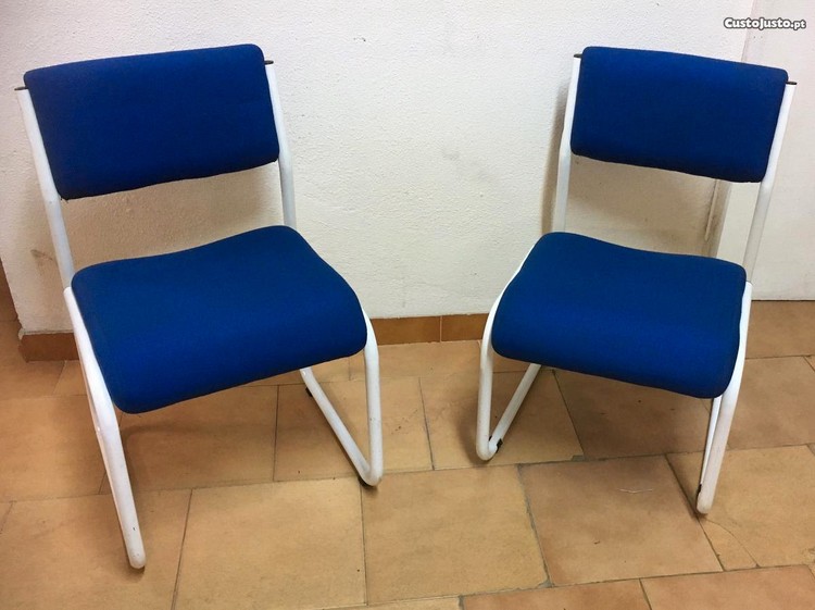 Conjunto de 2 cadeiras fixas com base em Patim branca estofadas a tecido azul.