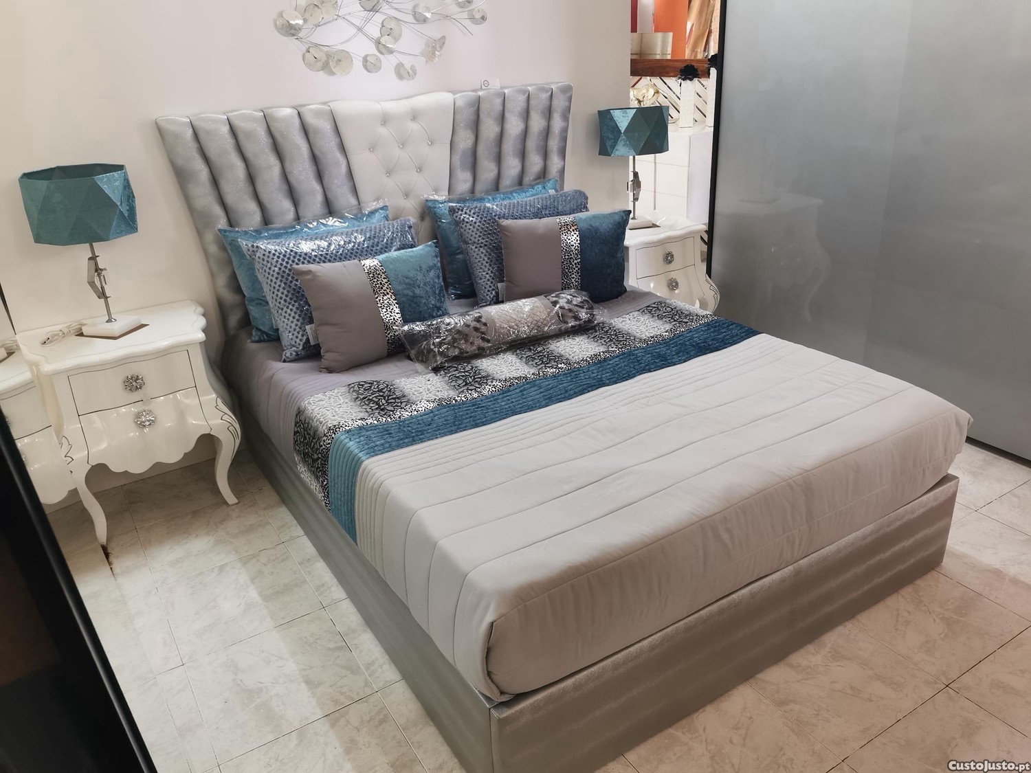 Cama estofada com um design moderno e elegante, combinando tons de cinza e branco nova, sem qualquer uso anterior (apenas está exposta numa loja de móveis, caso a pretenda ver fisicamente: Garmóvel).