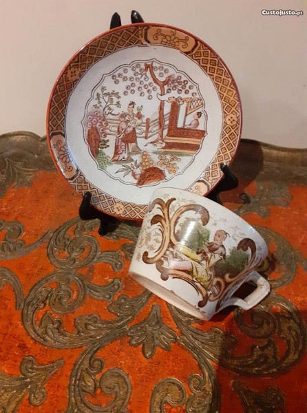 -Descrição: Chávena de chá em faiança Sarreguemines. Pintada à mão decorada com motivos orientais.