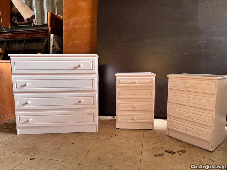 Este conjunto é constituído por 1 cómoda (4 gavetões com faltas de puxadores) e 2 mesinhas (4 gavetas em cada com falta de puxadores). Todas as gavetas são de puxar e ambos os móveis têm algumas marcas de uso.