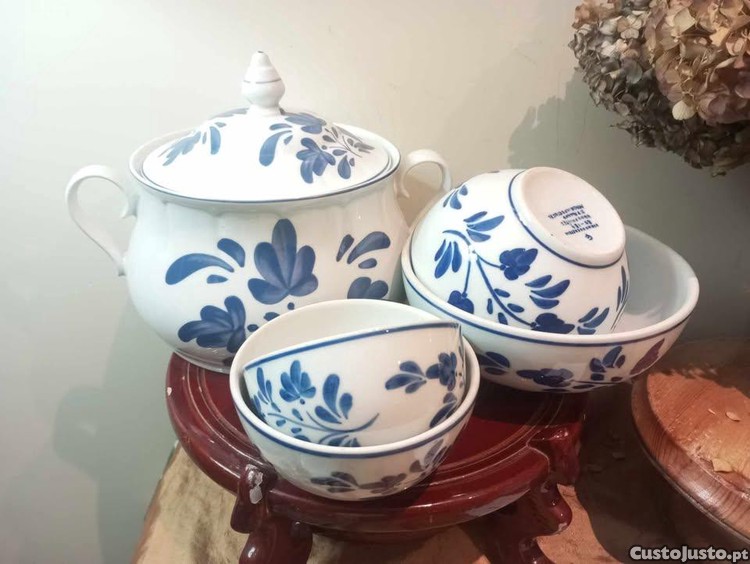-Descrição: conjunto de louça típica de Viana do Castelo composto por terrina e quatro tigelas de diferentes tamanhos. Terrina marcada com carimbo e tigelas assinadas.