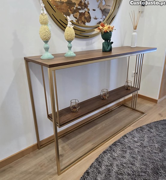 Consola de entrada em ferro galvanizado pintado em dourado. Madeira cor nogueira.