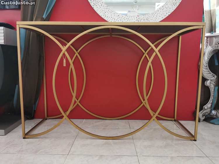 Consola de entrada com um design moderno e elegante. A sua estrutura em metal dourado confere um toque de sofisticação a qualquer espaço.