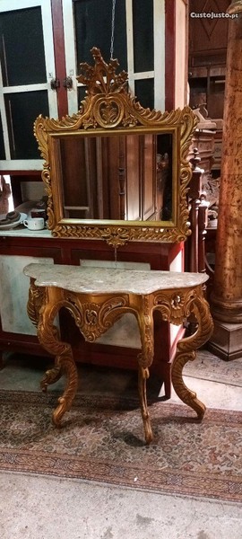Credencia Dourada Com Espelho em perfeitas condições tem 0,98cm×0,36cm alt. 0,77cm. Espelho tem 0,80cm larg. 0,90cm alt à concha.