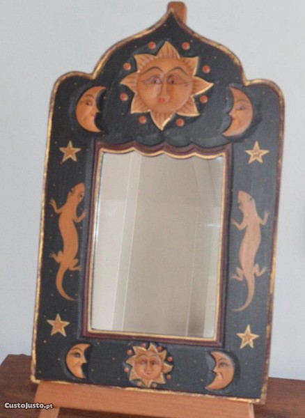 Espelho de parede em madeira pintada, ornamentado com desenhos da a Lua, o Sol e Lagartos. Trabalho artesanal com origem na Indonésia.