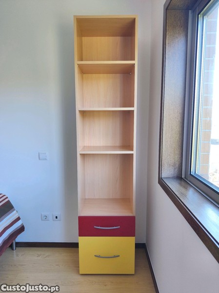 Estante de madeira clara com gavetas, ideal para organizar e decorar a sua sala de estar ou quarto. Possui 4 prateleiras e 2 gavetas coloridas, proporcionando espaço de arrumação e um toque de design ao seu ambiente.