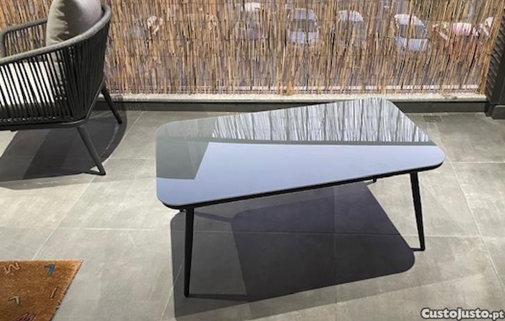 A mesa é nova e pertence a um conjunto sofá e cadeiras que comprei mas que não posso usar devido às dimensões reduzidas da minha varanda.