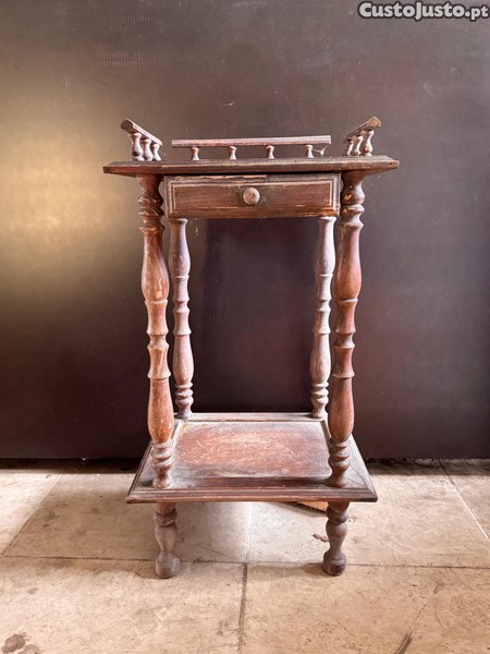 Este móvel contém uma gavetinha pequena e (para além deste estilo monarca) uma das pegas (direita) está descolada, precisa ser colada ou pregada ou aparafusada, de resto precisa ser restaurada.