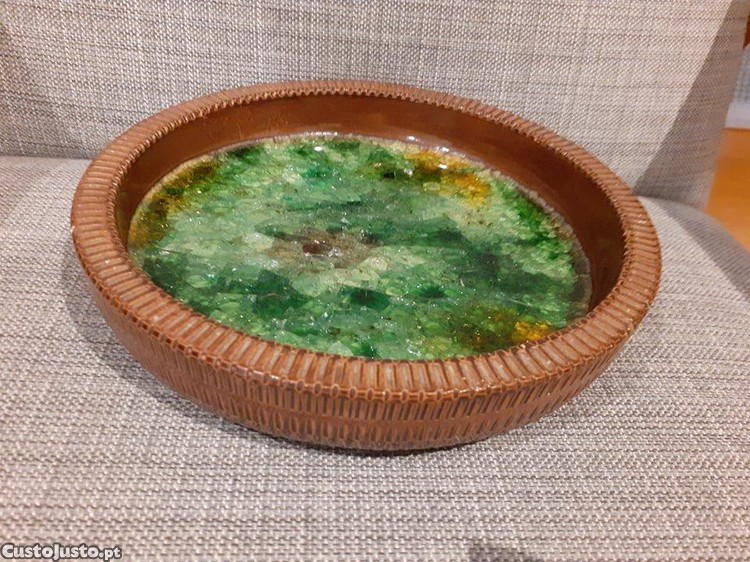 -Descrição: peça decorativa em cerâmica vidrada com efeito canelado, fundo vidrado craqueleado em tons de verde e castanho. Peça com base em veludo.