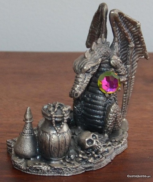 Invulgar peça em Estanho de elevadíssimo grau de pureza, retratando uma das personagens da zaga Senhor dos Anéis. Peça assinada, intitulada Dragon Of The Treasure. Dimensões: 8,2 x 5 x 7 cm. Peso: 0,520 Kg. Origem: United Kingdom. Artigo em perfeitíssimo estado de conservação. Possibilidade de adquirir a peça por um preço consideravelmente inferior ao seu verdadeiro valor de mercado.