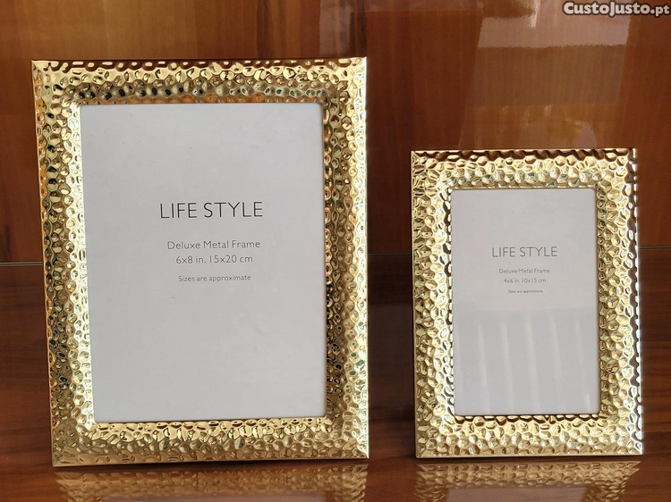Lindas molduras douradas, estilo amassado, para dar um toque de requinte à sua decoração. São duas peças, perfeitas para fotos de momentos especiais.