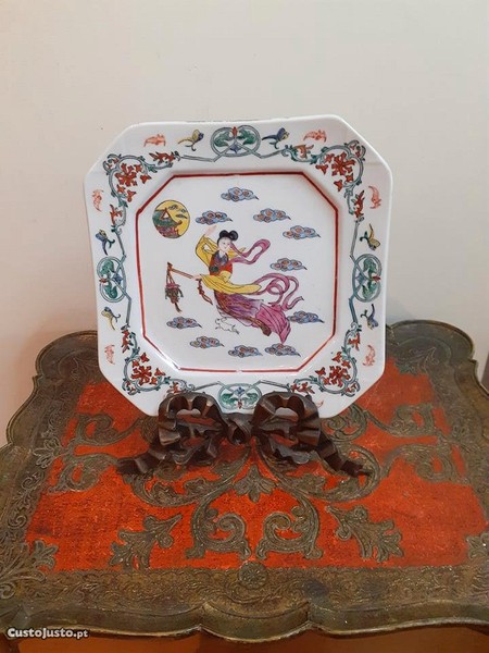 -Descrição: prato em porcelana de Macau, pintado à mão e decorado com motivos orientais. Peça marcada com carimbo.