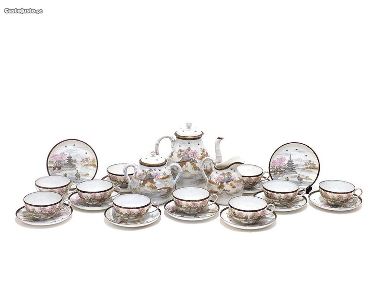 Serviço de Chá, em porcelana branca casca de ovo, composto por bule, leiteira, açucareiro, dez chávenas e dez pires. Policromada, pintado à mão, com complementos a ouro, decorado com paisagem e figuras chinesas no seu dia a dia, asas com relevo em forma de cana de Bambu. Possibilidade de troca por algo de meu interesse. Para ver ou levantar em Amares-Braga.