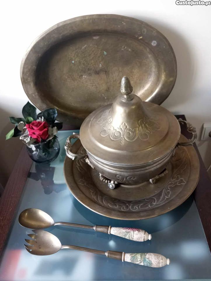 -Terrina com prato em latão, trabalhada com motivos vegetalistas. A terrina tem 4 pés, num deles existem 3 marcas, no entanto, penso não se tratar de um contraste. Peça bastante pesada. Estado: Excelente. Medidas: Terrina: 31 cm de asa a asa. Valor: 30EUR