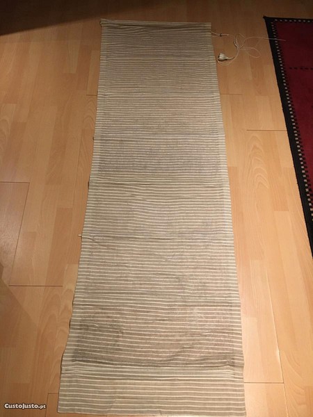 Cortina em estore com calha, cor beje/castanho claro, com ristas, em bom estado, ideal para porta.