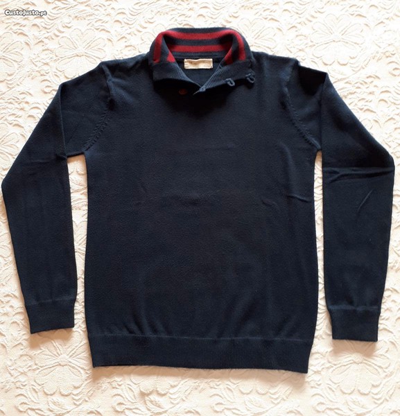 Camisola zippy boy em malha, com gola de trincha a fechar com 3 botões. Cor azul marinho com riscas vermelhas na gola.
