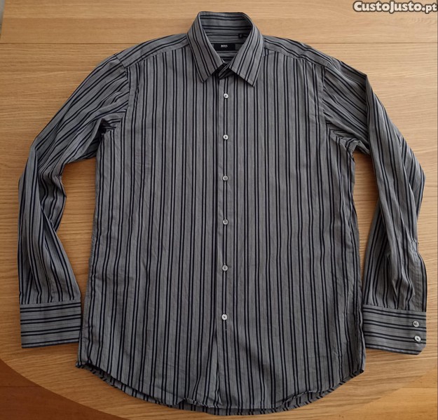 Camisa da Hugo Boss, com padrão de riscas azuis e cinzento, tamanho 41 (equivale M/L). Marca alemã de prestígio, associada a moda elegante e duradoura. Camisa praticamente nova: sem manchas, booms de cor, botões originais. Excelente para eventos, trabalho ou uso casual refinado.
