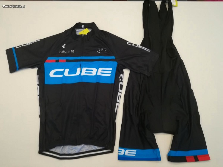 Equipamento em tecido colmax para uma evaporação rápida, calção com alças pretas carneira com gel, camisola com fecho preto até baixo, três bolsos nas costas da camisola e fita antideslizante nos calções e camisola.