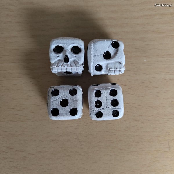 Dados diferentes do comum a imitar uma caveira tal como nas fotos, são um poucos maiores que os dados normais, valor elo conjunto de 4 dados.
