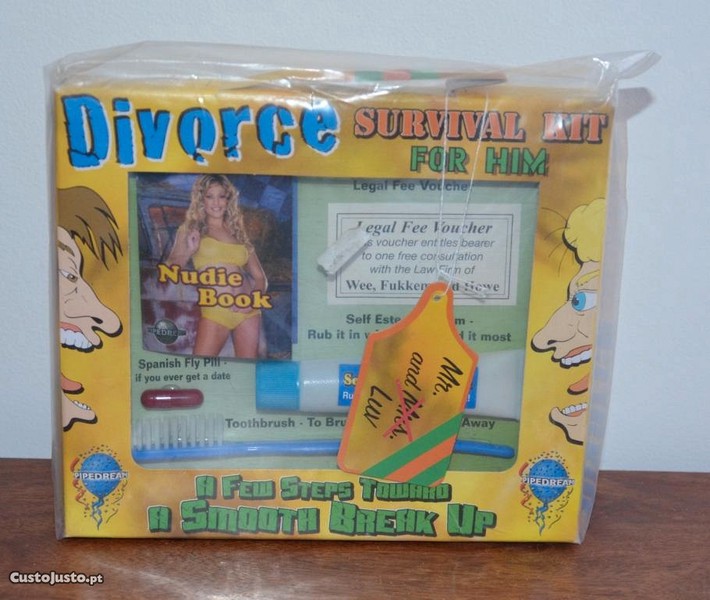 Brinque com um seu amigo prestes a divorciar-se ou até já divorciado, oferecendo-lhe este engraçado Kit de Sobrevivência para Divorciados.