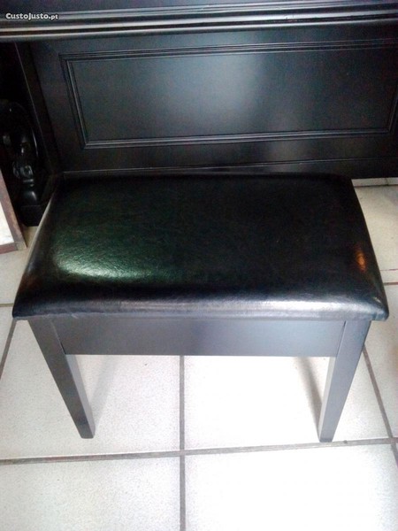 Banco de piano com tampo de elevação para guardar pautas, estofado em pele e em estado impecável.