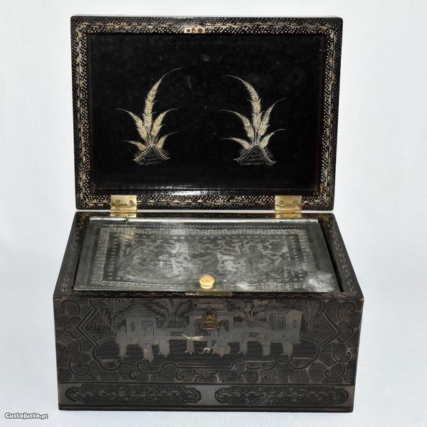 Caixa de Chá em Charão, decoração a prata com motivos orientais, interior com caixa amovível