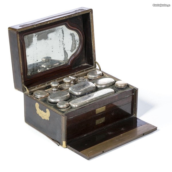 Caixa toilette francesa de viagem em madeira de pau santo com aplicações em metal do século XIX.