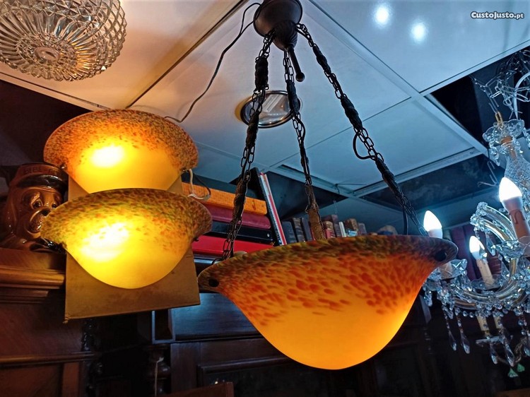 Candeeiro de tecto de 3 lâmpadas e 2 apliques de 1 lâmpada em vidro colorido.
